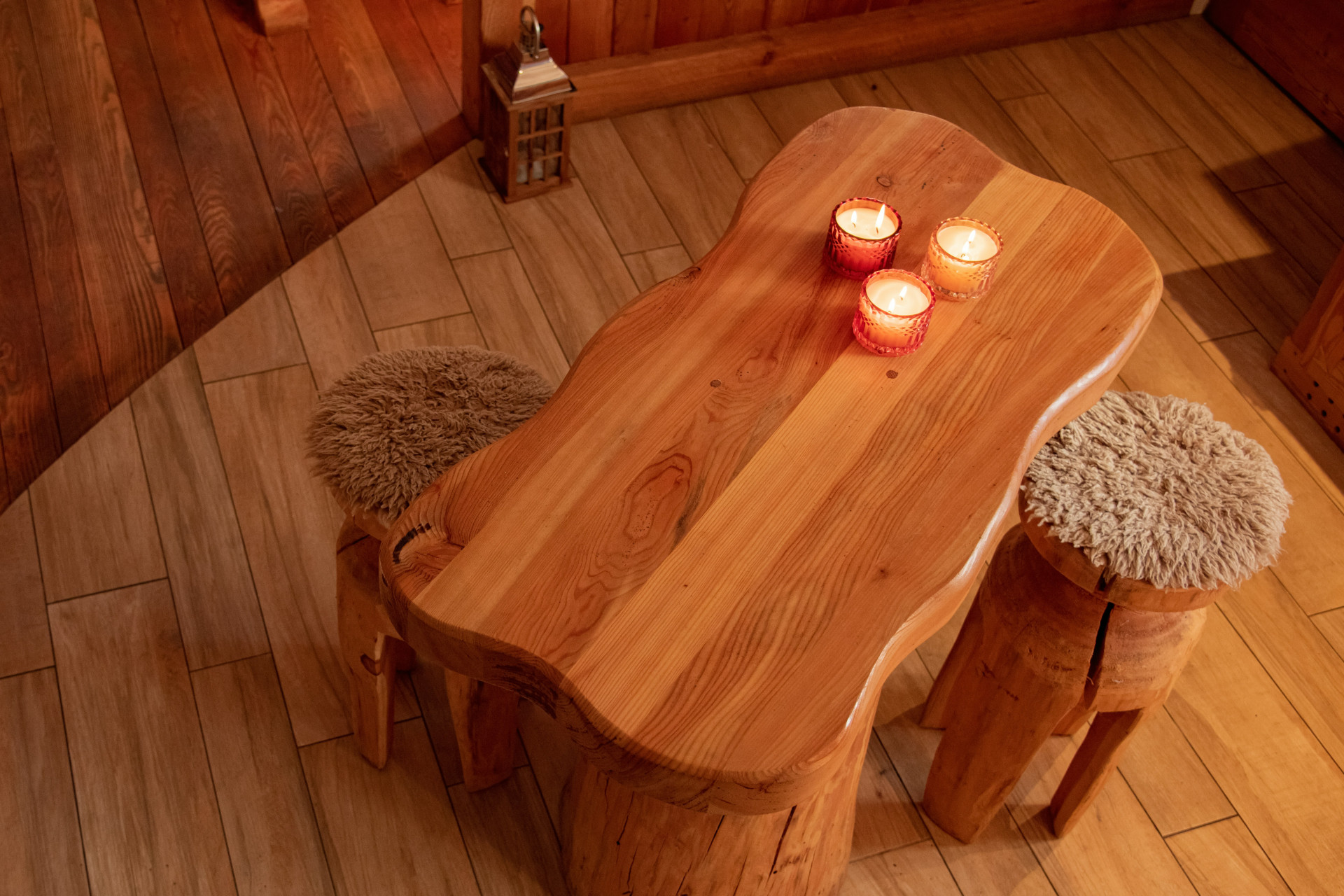 Taburetten kan anvendes som siddeplads, sidebord eller dekorativt element i indretningen. Den naturlige overflade fremhæver træets struktur og giver et varmt og organisk præg til rummet.